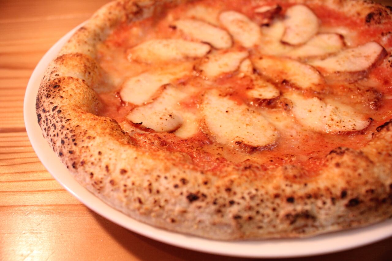 ナチュラル工房la vitaのピザは、北海道産の小麦粉を自家製天然酵母で熟成させた自慢の生地がベースです。縁がこんもりと盛りあがりモチッとした食感のナポリスタイルで、ポツポツと黒茶色についた焦げ目が風味を豊かにしています。